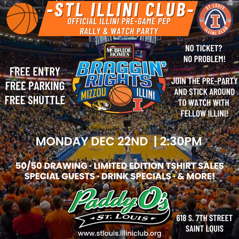 You’re invited to join fellow Illini fans for a pregame party prior to the Illinois vs. Missouri men’s basketball game in St. Louis, MO. Celebrate the orange and blue with raffles, 50/50 tickets, and special appearances from University leadership and more!  Please visit our Facebook page for the most up-to-date information!  Please click the link below to register for the event.  Pre-registration is highly-encouraged.